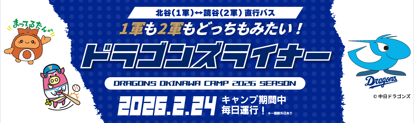中日ドラゴンズの2026年度春季キャンプ期間中(2/1~2/24)は、北谷町(1軍キャンプ地)と読谷村(2軍キャンプ地)を結ぶ直通バス 「ドラゴンズライナー」 が運行します。