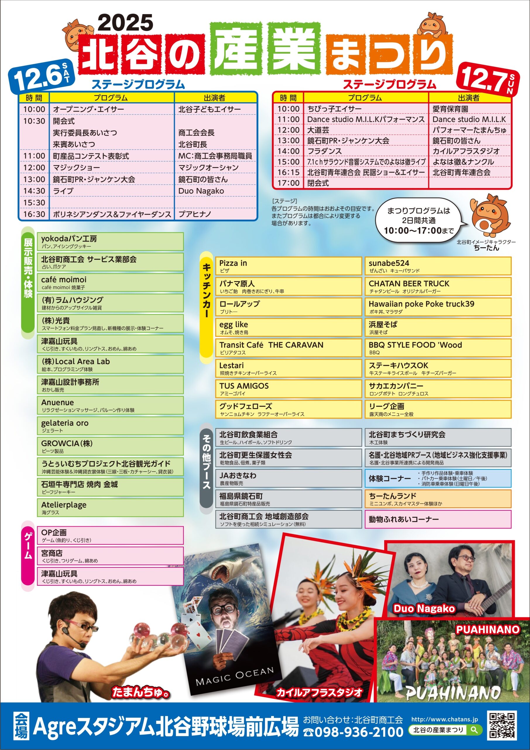 | 主催者 | 北谷の産業まつり実行委員会(北谷町商工会・北谷町観光協会・北谷町飲食業組合・北谷町漁業協同組合)[共催]北谷町 |