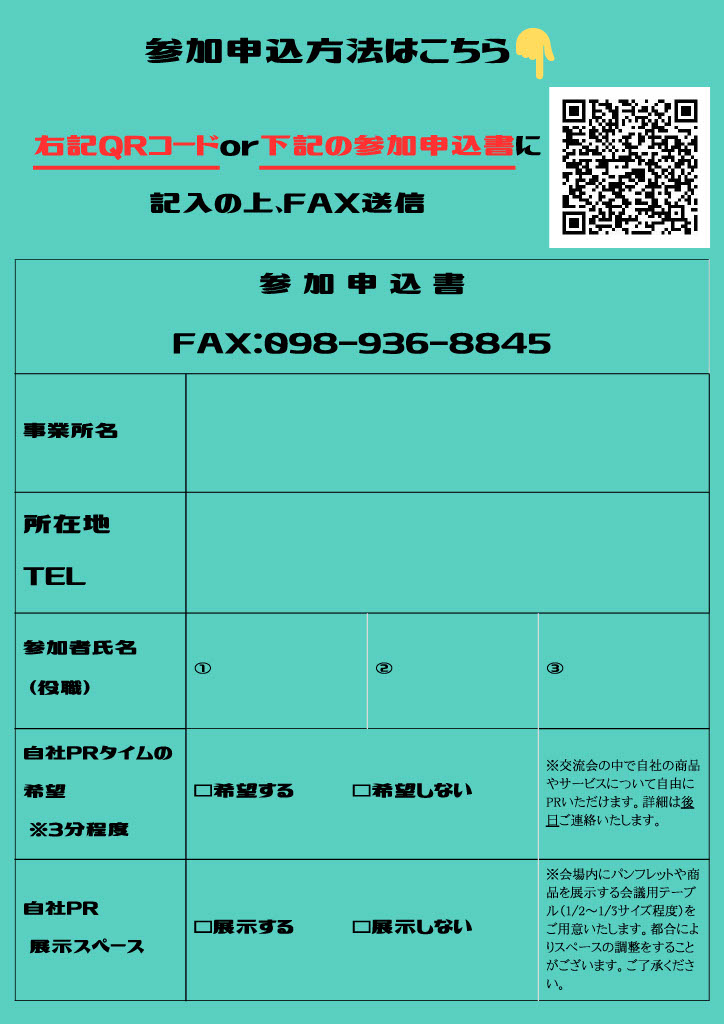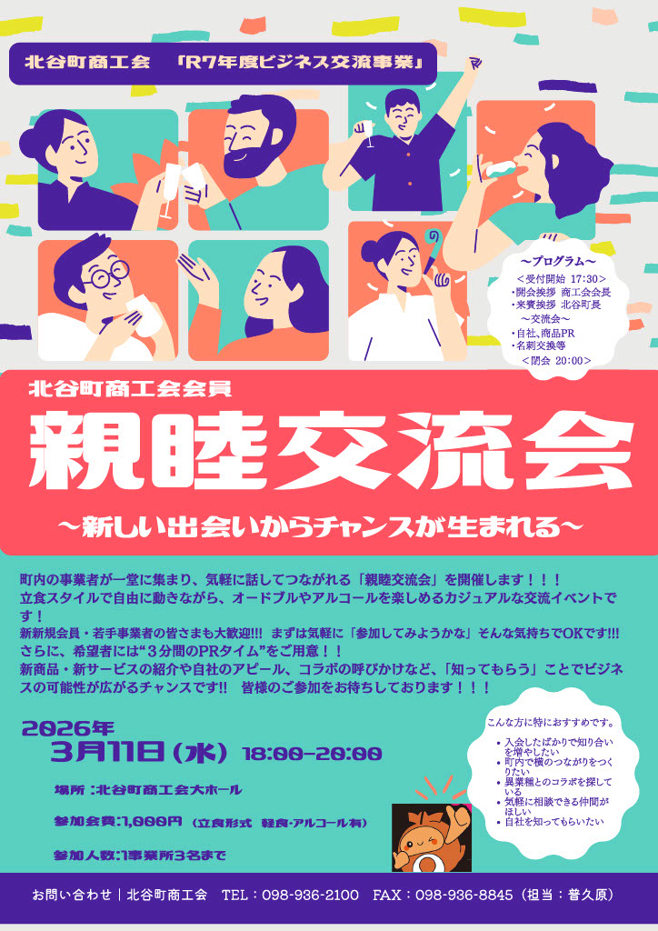 北谷町商工会では3月11日(水)18時から会員親睦交流会を開催します。リラックスした雰囲気の中で交流を深め、今後のビジネスチャンスにつながる場としてご参加くださいますようお願い申し上げます。詳細は下記のチラシをご覧いただき、お申込みは①申込書をクリックし入力、②チラシ内QRコード、③参加申込書へ記載した後FAX等どの方法でも可能です。