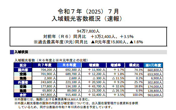 令和7年7月入域観光客統計概況(令和8月25日公表)