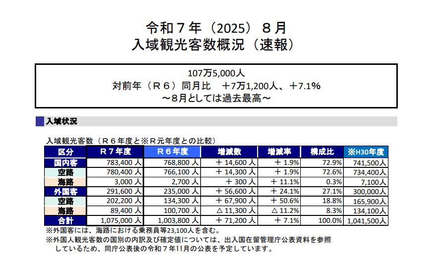 沖縄県より、令和7年8月の入域観光客統計概況がでております。